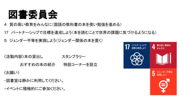 鬼中SDGs・・・各委員会で様々な活動を行っています。