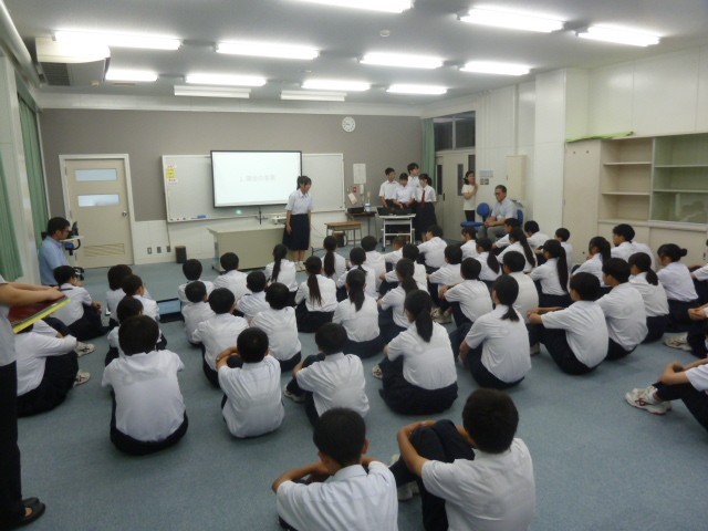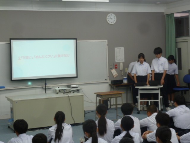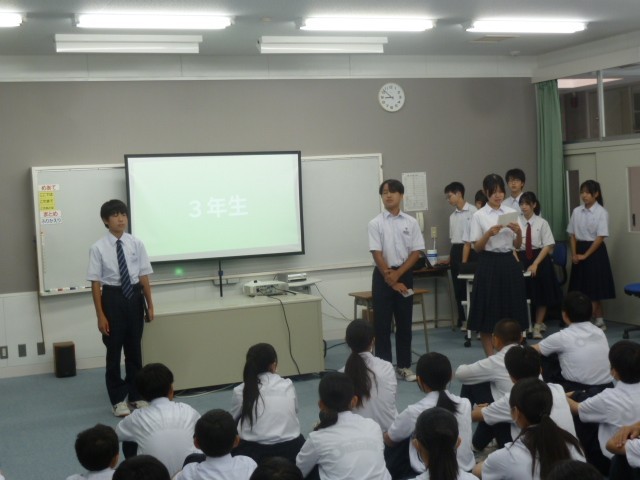 1学期終業式の後は、生徒会本部が企画・運営する生徒集会です。まず、各学年の代表生徒が1学期の生活を振り返り、漢字一文字で表して発表しました。聞いている側は、「なるほど」と思う内容ばかりでした。どんな漢字であったかをぜひお子さんに聞いていただければと思います。次に、夏休みの過ごし方について4つの提案がありました。教師から押しつけられるものでなく、生徒自らが考えた提案だったので、夏休み中は、きっと4つの提案を意識しながら生活してくれることと思います。40日あまりの夏休みが始まりますが、有意義な休みにしてほしいです。