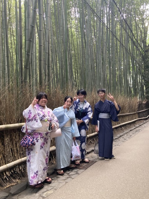 9月7日(日) 3年生 修学旅行1日目 竹林の小径 公開日 2025/09/08 更新日 2025/09/07 3年修学旅行 またまた嵐山で別の班と会いました。この班は着物のレンタルをして班別行動をしています。暑い気候の中でも、意外にも通気性が良いと言っていました。