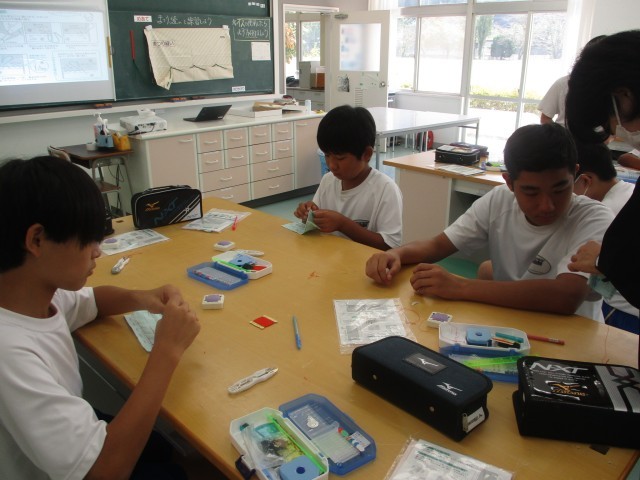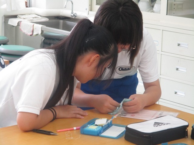 1年生の家庭科はまつり縫いの練習でした。今日は、布に印刷された教材を使って、まつり縫いの練習をしました。先生の説明を聞きながら丁寧に作業していました。
