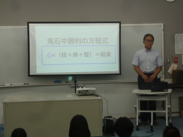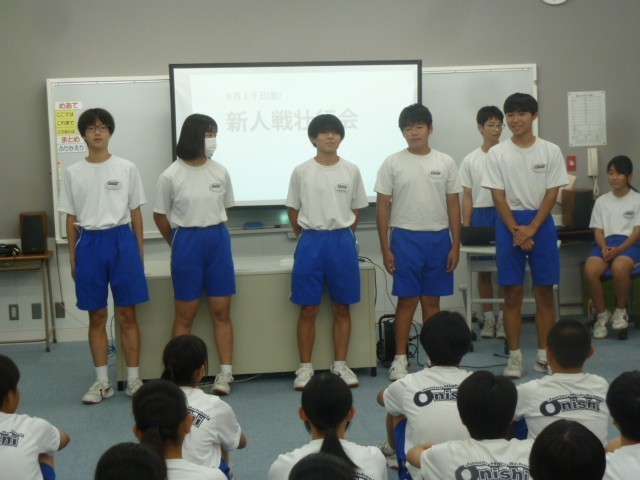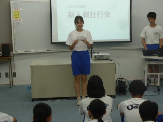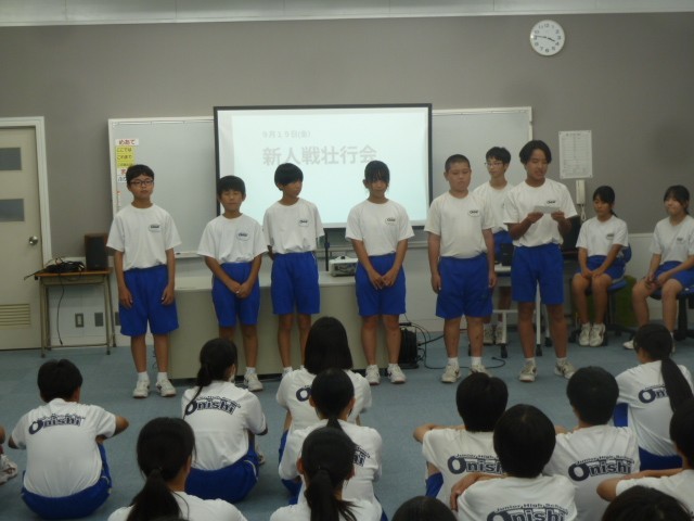 部活動を引退した3年生が見守る中、藤岡多野中体連秋季大会の壮行会を行いました。「野球部」「陸上部」「ソフトテニス部」「新体操部」の各部員が大会に向けた決意を発表しました。緊張しながら発表していましたが、どの部の発表も熱い思いを感じるものでした。校長先生からは、大会に向けて「鬼石中勝利の方程式」が授けられました。明日からはいよいよ大会です。自分の全部の力を出し切ることを最大の目標にがんばってほしいです。