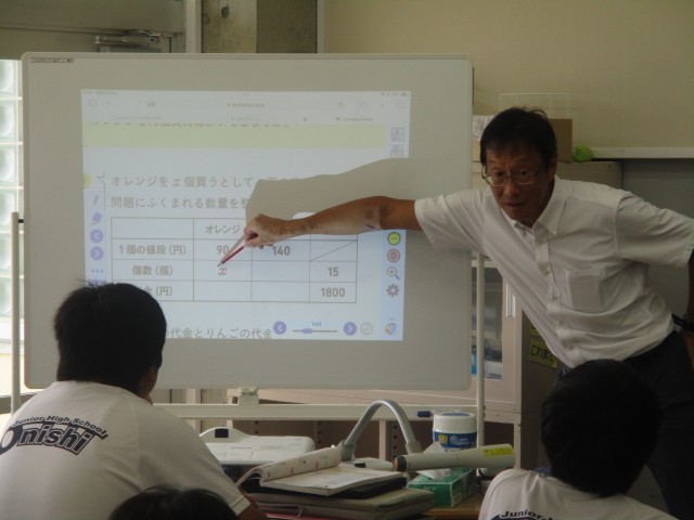 1年生の数学は1次方程式の学習でした。今日は1次方程式を利用して立式し解く問題に取り組みました。