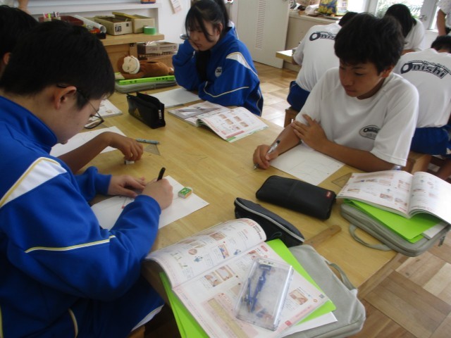 1年生の技術は製図の学習でした。今日は、ワークシートを使って等角図の書き方を覚えました。