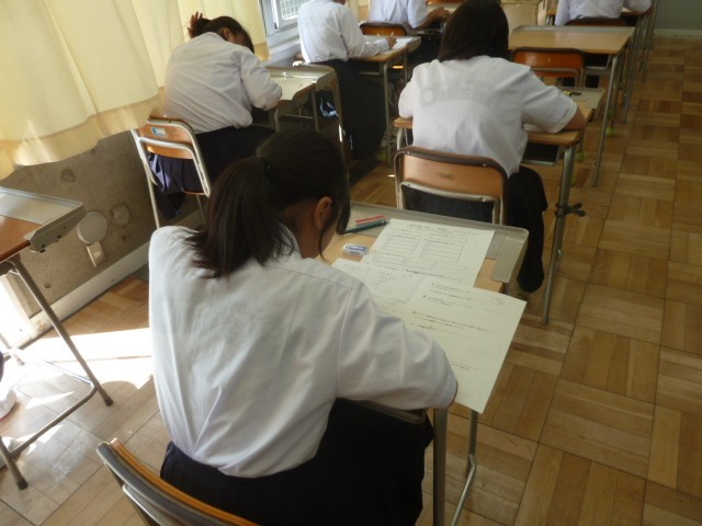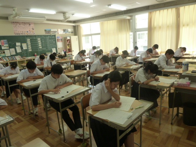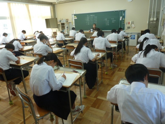 2学期中間テストの2校時は、「数学」です。シーンとした雰囲気の中で黙々と問題に取り組む3年生でした。3年生は少し疲れた表情でテストを受けている感じがしましたが、かなり遅い時間までテスト勉強をしていたのではと推測します。疲れに負けずに頑張れ、3年生。