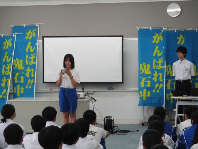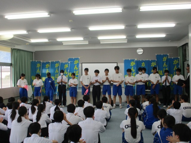 明日の大会を前に、壮行会を行いました。今年度は少人数ながら、担当の先生と共に7月から練習を積み重ねてきました。一人一人力強い決意表明を受けて、生徒会長、校長から選手達にエールを送りました。明日は自分を信じ、仲間を信じて、自分の精一杯をやり抜き、次の走者に襷をつないでほしいと思います。選手諸君の健闘を祈ります!