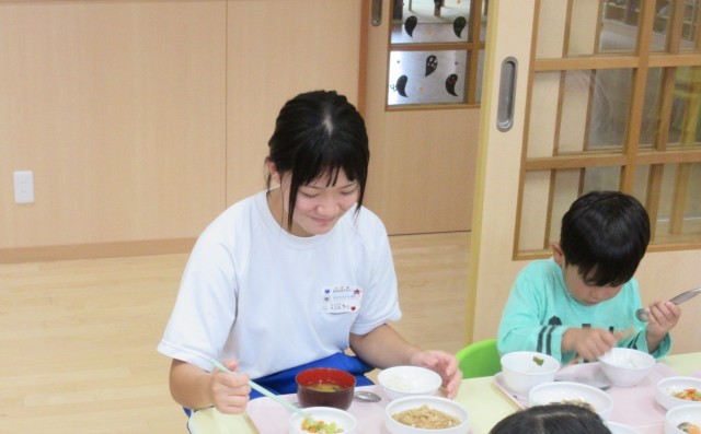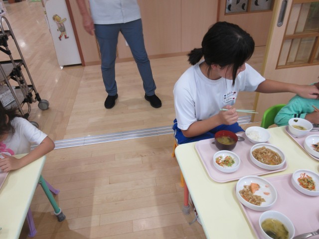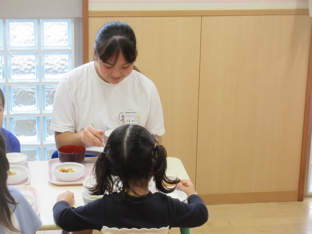 昨日に続いて、今日は給食の時間にお邪魔しました。みんなで楽しそうに食べていました。テーブルも食器も小さめでみんなかわいいです。
