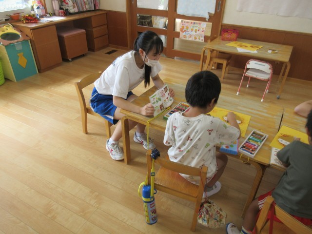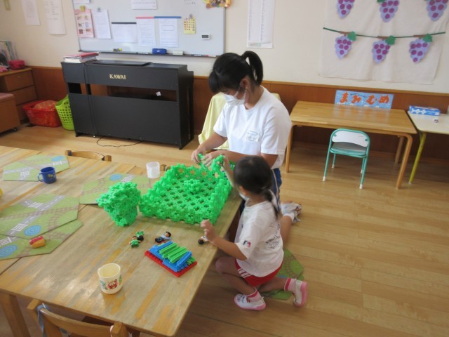 午前中は園庭で運動会の練習をしていたようですが、暑さのために室内に戻り、自由遊びの時間になりました。年長・年中・年小の3クラスに一人ずつ配属され、園児と一緒に遊んでいました。全員の子に目配りをしながら遊ぶのは、大変そうでした。