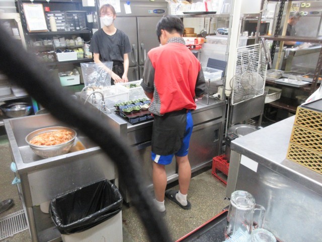 今日は午後からの勤務でした。男子は厨房で小鉢用の皿を並べていました。女子は館内の清掃作業を行っていました。いろいろな仕事が体験できています。