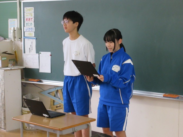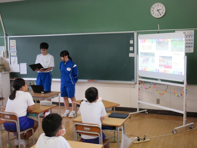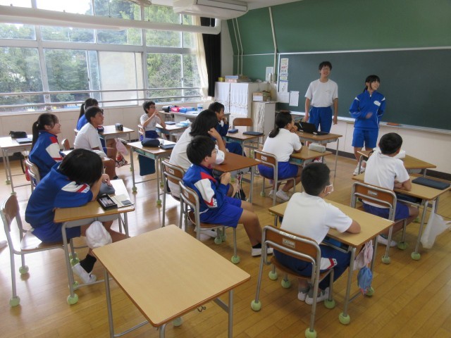 本日は、チャレンジウィークに来ている中学生が6年生の教室に行き、中学校のようすを紹介していました。プレゼン用の資料も用意して、わかりやすく話していました。話が短時間で終わってしまったので、たくさん質問を受け付ける時間が取れました。