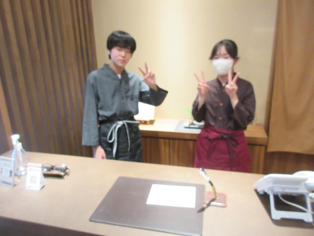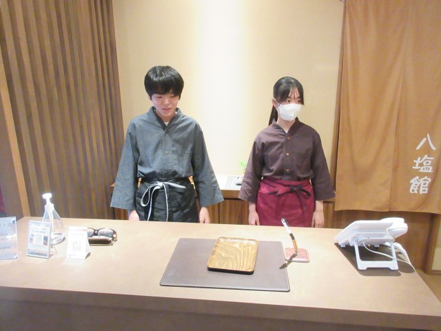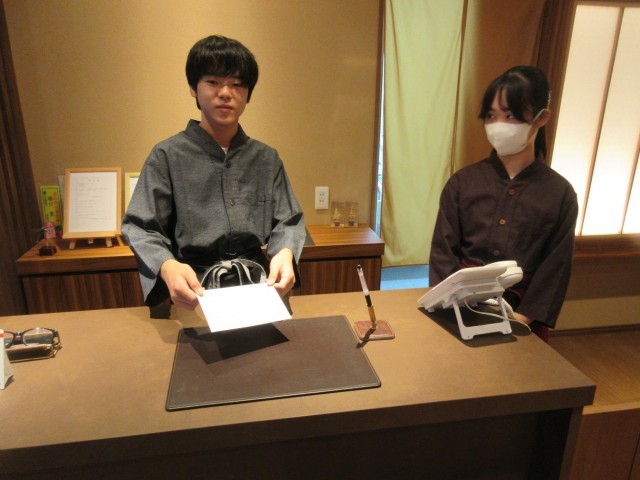 週の前半はファミリーマートで販売の仕事を体験し、後半は旅館でサービス業の仕事を体験しました。昨日は客室の清掃作業を中心に行いました。本日は食事会場のセッティングとフロント業務を行いました。ユニフォームがよく似合っています。