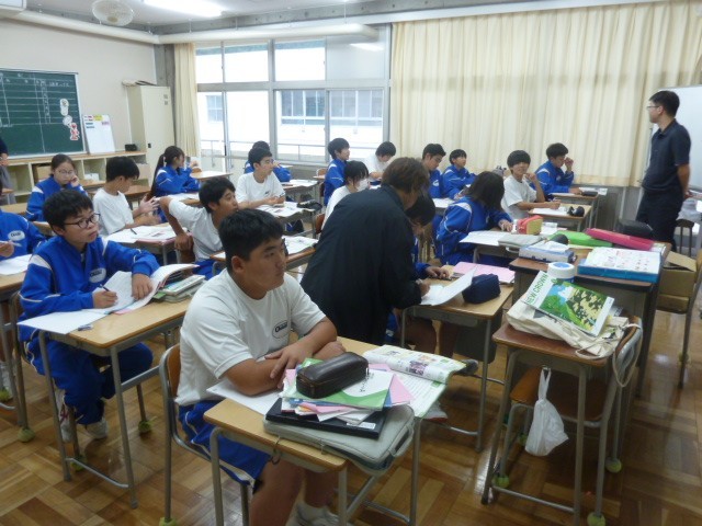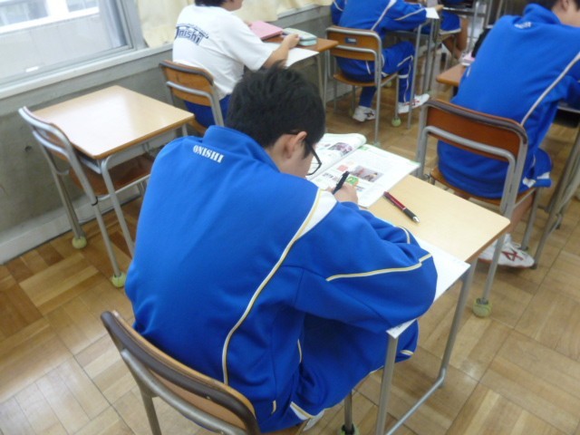 「be動詞+動詞ing」の英語表現である「現在進行形」を学習した1年生は、「~しているところです。」の習熟を図っていきます。先生から日本文を提示されると、それを英文に直してノートに記述します。「Youの時のbe動詞は何だっけ?」「amはIの時のbe動詞だよね。」少し心配なときは、友達と相談しながら、先生からの問題に答えていきます。最後は応用問題として「あなたは、今何をしているところですか?」という日本文を英文に直すという問題が出されました。悩みながらも何とか英文で記述することができた1年生でした。