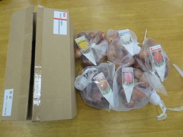 日本教育公務員弘済会様よりたくさんのチューリップの球根をいただきました。環境美化委員会が中心になって栽培していく予定です。赤・白・黄色のチューリップの花で鬼石中をいっぱいにしていきたいと思います。春が来るのが今から楽しみです。日本教育公務員弘済会様、ありがとうございました。