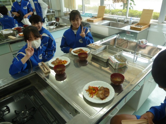 職員室にいると、とてもいいにおいがするので、においの先に行ってみました。調理室で2年生がちょうど調理実習をしているところでした。今日のメニューは、「豚の生姜焼き」と「コンソメスープ」です。中学生になるとかなり手の込んだ料理になります。グループのメンバーと協力しながら作っていました。きっといい味になっていることと思います。家庭でもお子さんに「豚の生姜焼き」と「コンソメスープ」を注文してみてはいかがでしょう?「しょうがないなあ。」と言いながらも、おいしい料理を作ってくれると思います。