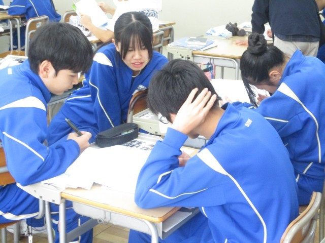 3年生の数学は関数 y=ax二乗の学習でした。今日は、単元のまとめで、章末問題に挑戦しました。生徒同士で解き方を比べ合いながら、学習を進めていました。
