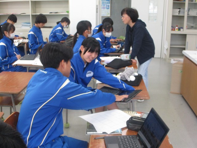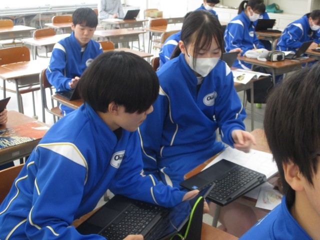 2年生の美術は篆刻でした。今日は、木製の箱にどのようなモチーフやデザインで篆刻するかをワークシートに下書きしました。友だちと相談したり、PCで調べたり、先生にアドバイスをもらったりしながら作業を進めていました。