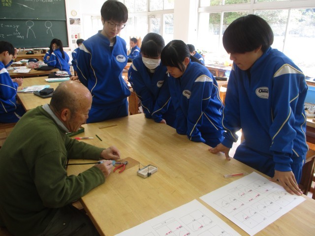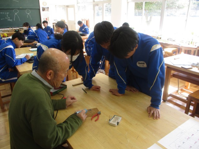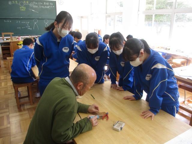 2年生の技術は、はんだ付けの練習でした。今日は、担当の先生のはんだ付けの実演を見て、道具の正しい使い方を確認してから、作業に入りました。