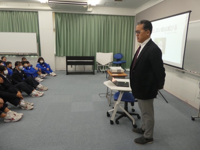 今日は業前に朝礼をしました。今日の話のテーマは「脱皮しない蛇は滅びる」でした。校長からは『私たちは「これで十分だ」と立ち止まってはいけない。常に「もっとよい方法があるのではないか」、「もっと新しい考え方があるのではないか」と問いかけ、自らを成長(脱皮)させ続けなければならない。慣れたやり方や楽な考え方にしがみつくのではなく常に新しい皮をまとった蛇のように、変化(脱皮)し続ける勇気を持ってほしい。』と、生徒たちに伝えました。