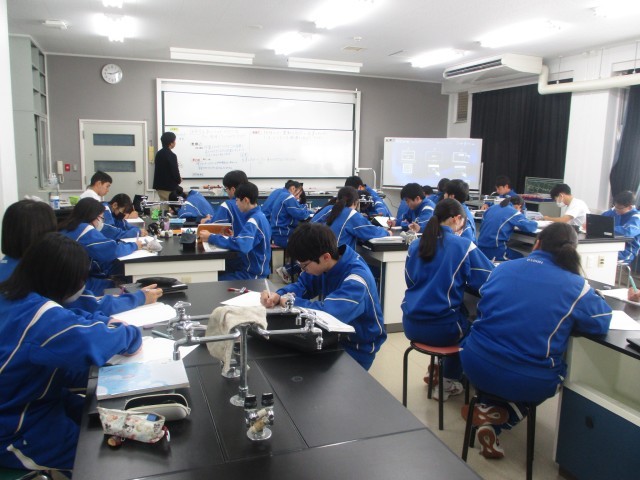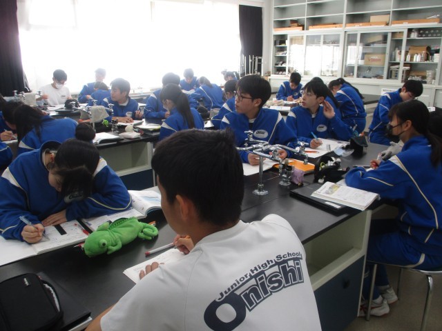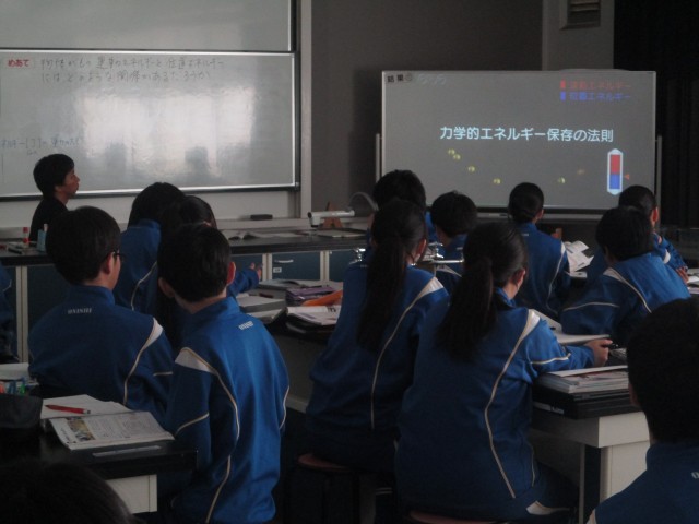 3年生の理科は力学的エネルギーの学習でした。今日は、物体がもつ運動エネルギーと位置エネルギーにはどのような関係があるのか考察しました。