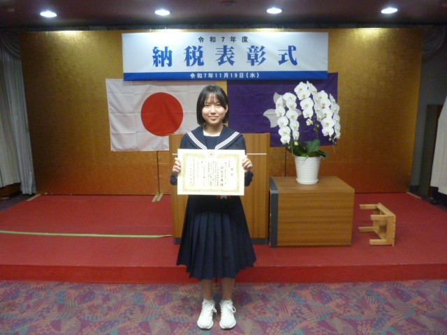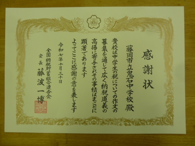 令和7年度納税表彰式が藤岡商工会議所で行われ、夏休みに取り組んだ「税についての作文コンクール」で関東信越国税局管内納税貯蓄組合連合会長賞を受賞した鬼石中3年の生徒が参加しました。多くの来賓が出席する中での表彰式だったので緊張したようですが、とても立派な態度でした。すばらしいです。おめでとうございます。また、鬼石中学校が税についての作文コンクールに毎年継続して作品応募に力を注ぎ、租税思想の高揚に多大な貢献をしたことを理由に藤岡税務署管内納税貯蓄組合連合会長様より学校に感謝状をいただきました。生徒のこれまでのがんばりが認められ、表彰されました。これもうれしい出来事でした。