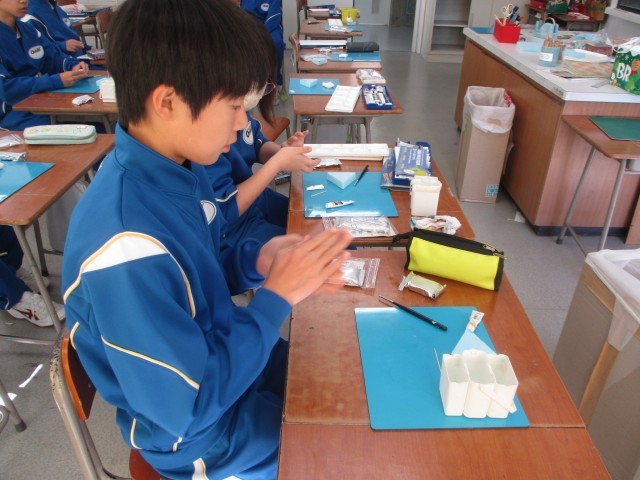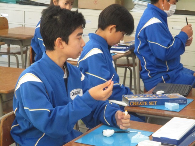 1年生の美術は粘土による造形の学習でした。今日は、かたちを整えたり、着色する活動を行いました。一見すると簡単そうに見えますが、思い通りに形にしたり着色したりするのは意外に難しそうでした。