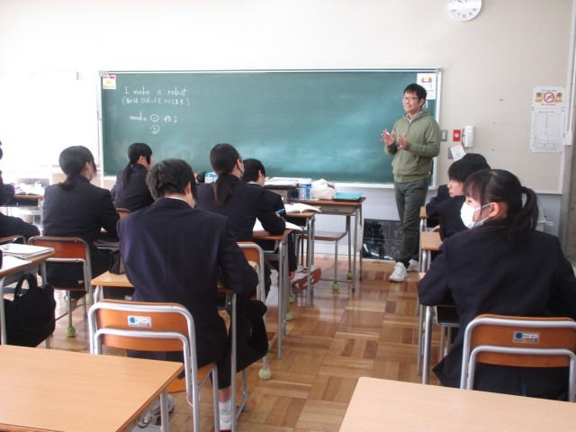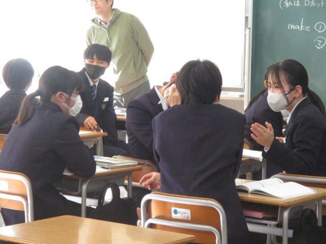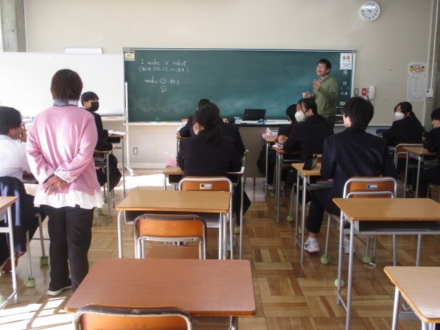 2年生の英語は第5文型の文の学習でした。今日は、目的語と補語をとる動詞 make をつかって、「~を・・・する。」という英文を作る練習をしました。