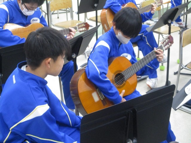 1年生の音楽はギターの学習でした。今日はチューニングの仕方やコードネームの仕組みを学習した後、いくつかのコードを実際に弾いてみました。
