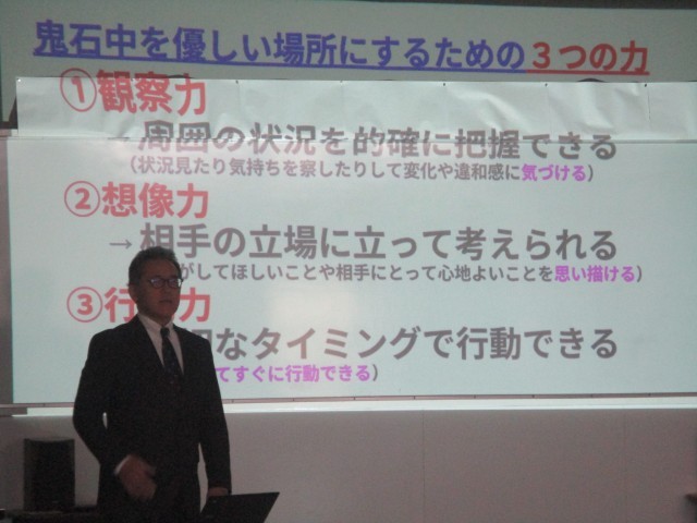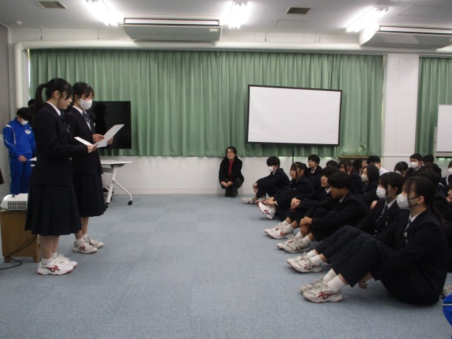 本日、業前の時間に後期人権集中学習の振り返りを行いました。今回は、集中学習期間の行動目標を「気づく人になる」、目指す学校の姿を「鬼石中を誰もが安心して自分らしく過ごせる優しい場所にする」とし、思いやりのアンテナを張って、周囲の仲間の「つらさ」や「不公平」に目を向けられるような気づきの力を身につけ、感じた違和感や変化を自分事として考え、状況をよくしていくような行動を適切なタイミングで実行する意識を高めました。集会では、期間中に行ったアサーションを3年生が実演し、よりよい人間関係を作るためのコミュニケーションスキルを身につけるための方法を全校で確認しながら振り返りました。「気づき」はよりよい集団を作る第一歩です。一人一人の気づきを偏見や無関心をなくす第一歩に繋げてほしいと思います。そして、そんな「気づく人」で鬼石中を満たし、鬼石中に、お互いを思いやり協力し合う文化をしっかりと根付かせてほしいです。