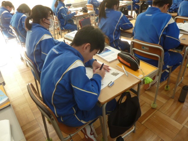 3年生の理科は、「冬の天気」の学習をしました。冬の日本は、北からの風が吹きます。中国から吹く風は、日本海の上を通るときに湿った風になります。その風が日本(日本海側)に上陸した際には、山にあたり、その周辺に雪を降らせます。新潟県で冬になると雪がたくさん降るのは、こういった理由からです。日本海側に雪を降らした風はその後、乾燥した風となり、太平洋側へと吹き込みます。群馬県では、この風のことを「からっ風」と呼びます。3年生の教室へ行ってみると、理科担当教師が説明をしているところでした。生徒の表情を見ると、「なるほど」と納得している様子でした。