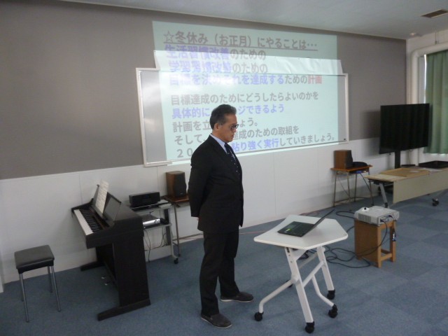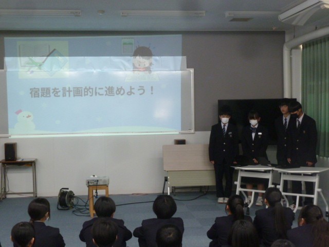 今日は2学期最後の日です。最初に表彰を行いました。運動面、文化面など、様々なジャンルで表彰された生徒に賞状を授与しました。鬼石中は小規模の学校ですが、大規模の学校に負けないくらいたくさんの賞状をいただきました。鬼中生が積み重ねてきた努力が成果につながりました。すばらしいです。次に2学期の終業式を行いました。校長先生からは、「成功するためには、計画を立てることが必要」という話がありました。冬休みにはぜひ成功(目標達成)に向けて、計画をしっかり立ててから生活してほしいです。最後に生徒会から、冬休み中の生活の仕方について4つの提案がありました。よりよい冬休みにするために、4つの提案を意識しながら、じっくり考えて、正しい判断をしていってほしいです。