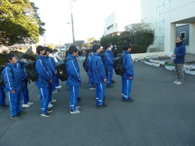 「立志」とは、「志を立てることで、自分の将来の目標を定めて、その実現に向けて、努力すること」です。昔の日本では、13歳から16歳頃にかけて、「元服」という成人を祝う儀式が行われていたことから、鬼石中では中学2年生を対象に立志の行として、「立志ウォーク」を行っています。まだ、寒さを感じる時間に出発式を実施しました。これから埼玉県の神社まで歩いて参拝したり、校区内にあるお寺で座禅体験をしたりなどの活動を予定しています。それでは、行ってきます。