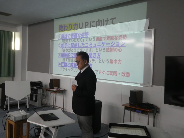 今日は業前に朝礼を行いました。今日の話のテーマは「教わり力を身につける」です。学びには「教える力」とともに、どう教わるかという「教わり力」もこれからは必要であると考えます。教わり力の高い人とは、先生の「教えたい」という意欲をかきたてるような表現を上手にできる人です。今日は「教わり力UP」のための4つのポイントを確認しました。