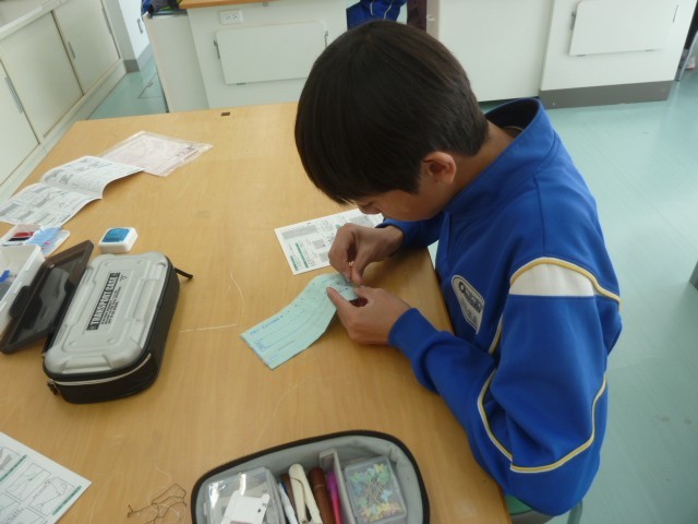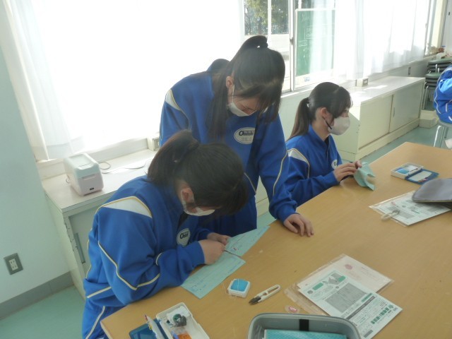 2年生の家庭科は、裁縫で「まつりぬい」の学習をしました。最初に動画を見て、まつりぬいの手順とポイントを確認します。その後は、練習用布を使いながら、まつりぬいの実習です。小学生の時にも裁縫の学習をした2年生ですが、心身ともに成長したこともあり、スムーズにまつりぬいをしていきます。いいですね、2年生。