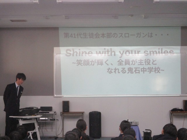 本日の業前は生徒集会でした。今日は、新生徒会本部の活動スローガンが示されました。新しいスローガンは「Shine with your smile~笑顔が輝く、全員が主役となれる鬼石中学校」です。鬼中生一人一人が、学校の発展・前進のために役割を担い、自分らしさを生かしながら力を発揮できるような学校を目指したいという、熱い思いが込められています。多様性の包摂を念頭に置いた、素晴らしいスローガンです。スローガンの発表に続いて、校則の見直し(案)も示されました。今後各学級で、中学生らしい服装や頭髪について改めてしっかりと話し合ったり確認し合ったりした上で、見直しを進めていく予定です。