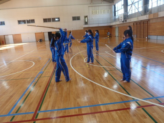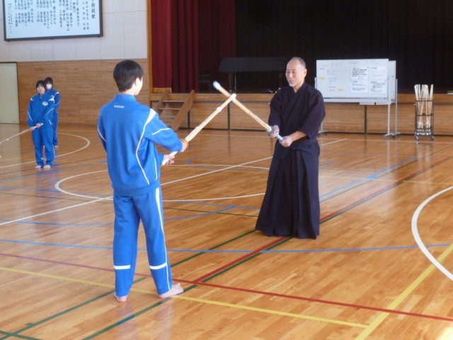 2年生の体育も剣道に取り組み、講師の先生に教えていただきます。まず、「メン」の打ち方を練習し、次に、「コテ」の打ち方の練習を行います。それぞれの動き方の違いに注意しながら、友達と練習を重ねます。しっかりと声を出しながら、元気よく動く姿が印象的でした。上達している2年生です。
