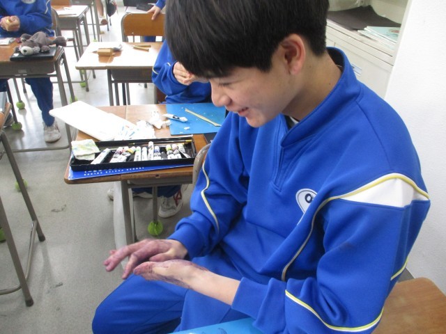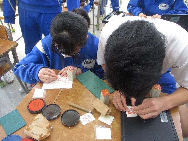 3年生の美術は篆刻・粘土細工の制作でした。篆刻は仕上げの段階で印影を確認しながら彫りの微調整をしていました。粘土細工は、着色した粘土を成形して和菓子を作っていました。
