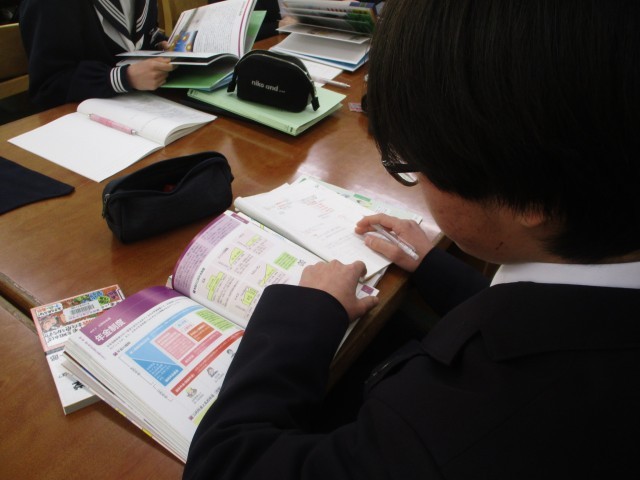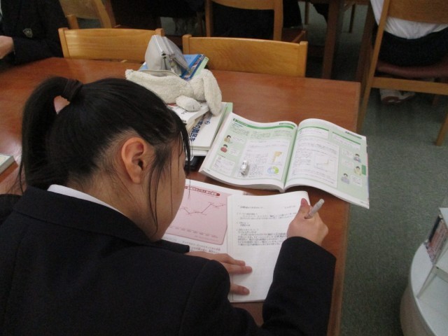 3年生の社会は各自で設定した課題に基づいて、レポートを作成していました。今日は、図書室の資料や文献を活用して、レポート作成の作業を各自で進めました。