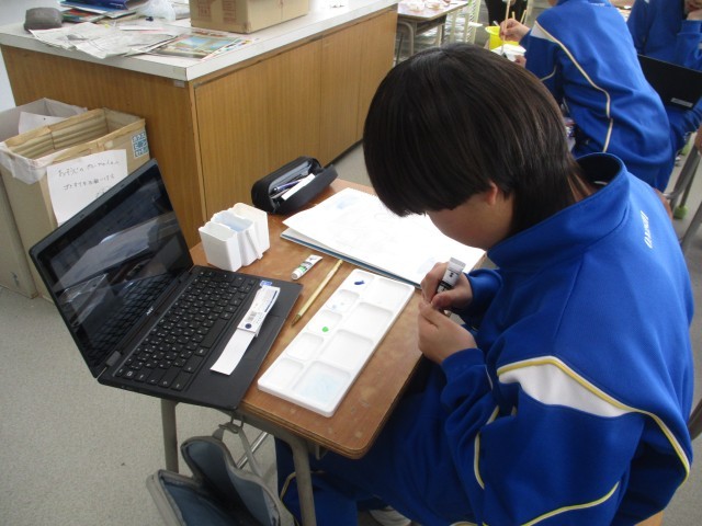 1年生の美術は水彩画の学習でした。配色や色の濃淡を考えながら、慎重に色を塗っていました。
