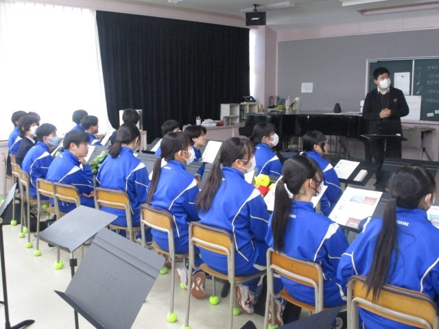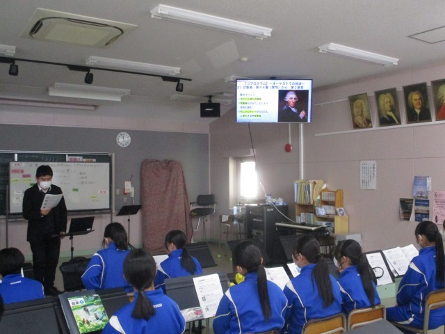 2年生の音楽は来週予定している移動音楽教室の事前学習でした。今日は、当日聴く演目を1曲ずつ試聴し、その特徴や聴きどころを確認しました。