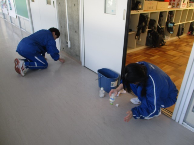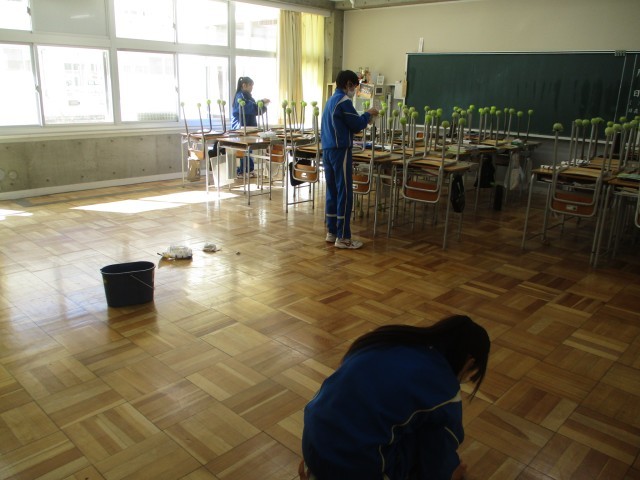 本日受検がない3年生は、昨日に引き続き愛校作業(環境美化)を行いました。床磨きや机の汚れ落としを丁寧に行っていました。