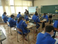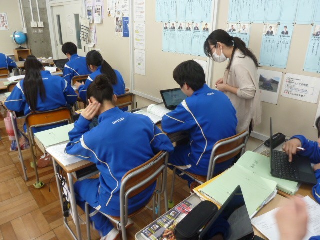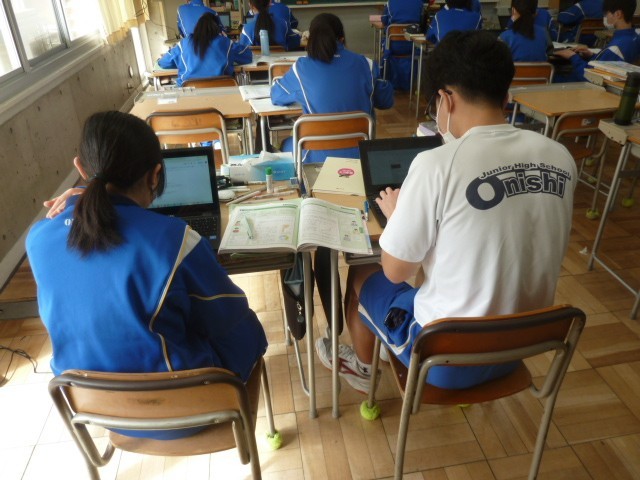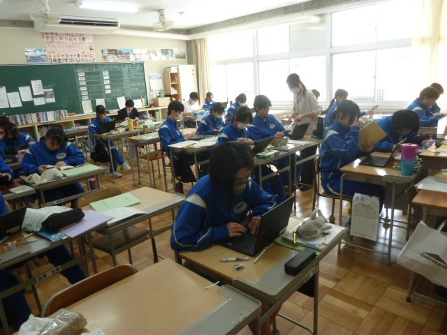 3年生の社会は、レポートの作成を行いました。3年間の社会科の学習の総まとめとして、個々にレポート作成に取り組んでいます。大きなテーマは「持続可能な社会をめざす」ですが、一人一人のテーマはそれぞれ違います。なかなか難しい活動なので、スムーズに進むよう担当の先生がアドバイスをします。全員のレポートが完成するのが楽しみです。