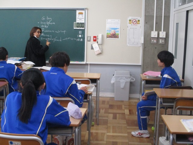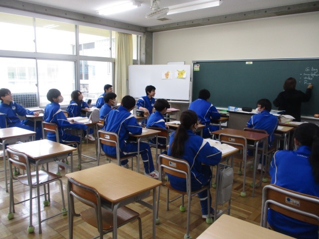 1年生の英語は技能統合的活動でした。今日は英文のコラムを読んで、その内容について、ALTと英会話しながら確かめました。