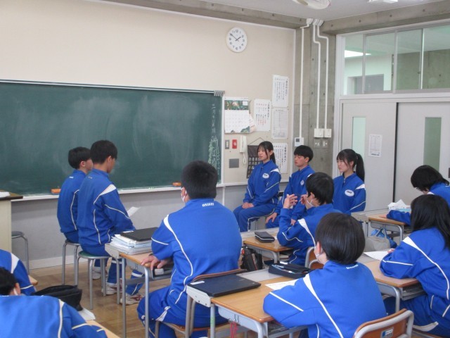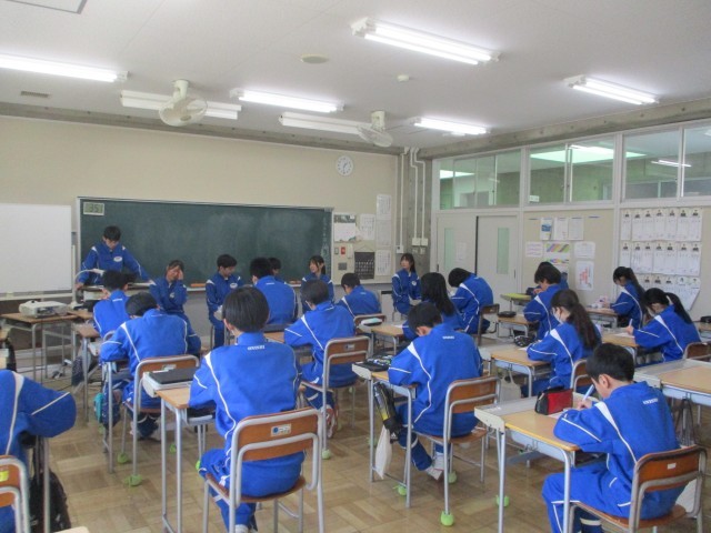 1年生の教室の様子です。メモをとりながら、真剣に3年生の話を聞いています。