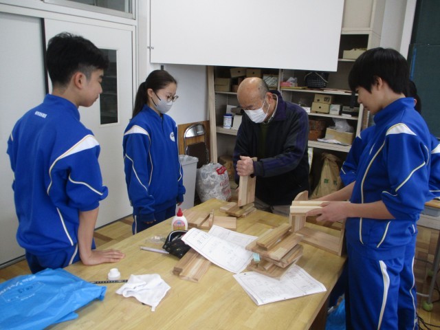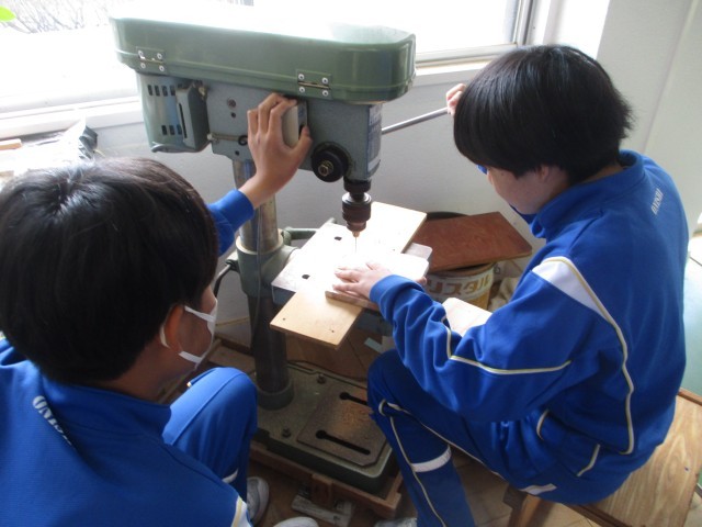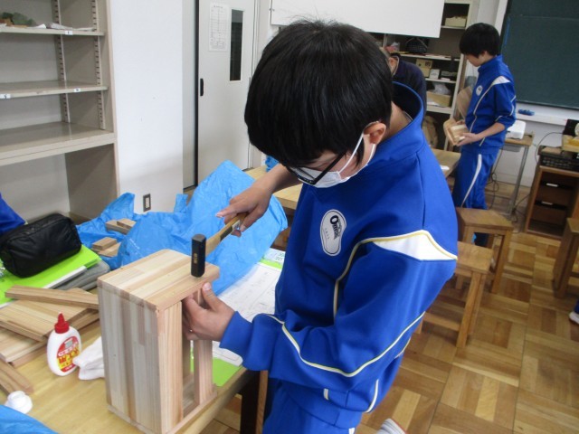 1年生の技術はティッシュ&小物入れの制作でした。今日も、各自で必要な作業を進めていました。作業は終盤で、小物入れの完成が近づいてきました。