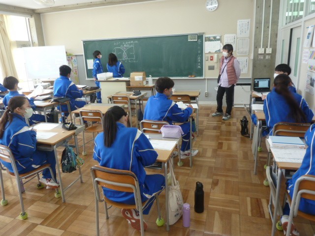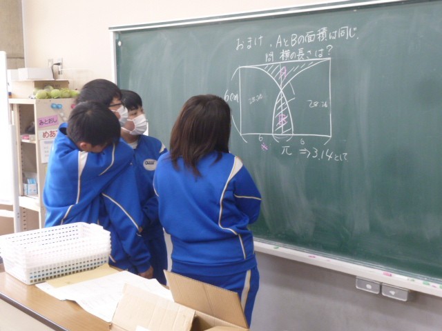 1年生の数学も1年間の復習に取り組みました。プリントの問題を解きながら、学習内容の理解を深めていきます。すらすらと問題を解く生徒や悩みながらも粘り強く答えを導き出そうと頑張る生徒、様々でした。中には、課題が終了し、先生から課された応用問題に取り組む生徒もいました。数人で知恵を出し合いながら、何とか正解を出そうとしていました。よくやっていますね、1年生。