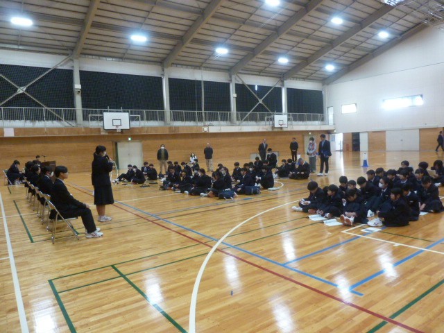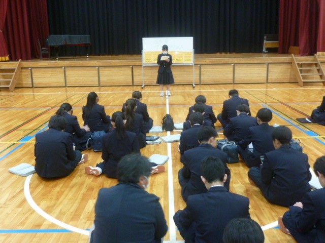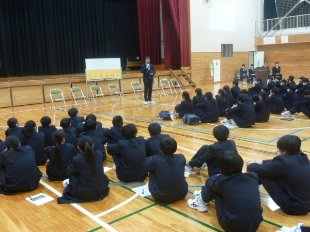 3・4校時は、全校生徒が体育館に集まり、「生徒会オリエンテーション」を行いました。前半は、よりよい中学校生活を送るための呼びかけや専門委員会の紹介をしました。生徒会本部役員や専門委員会の前年度の委員長が説明をしました。特に生徒会本部役員はクイズを織り交ぜて説明するなど、楽しみながら説明が聞けるよう工夫もしていました。1年生も「どの委員会に入ろうかな?」と話すなど、これからの中学校生活を想像しながら熱心に聞いていました。