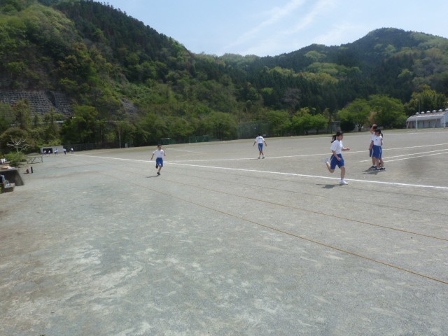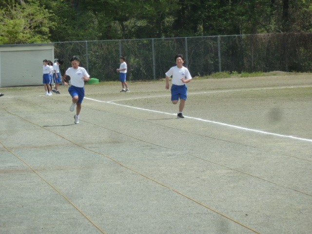 100Mを走り、タイムを計測しました。2人1組で走るので、隣の友達よりも先にゴールすることを目指します。しかし、大切なのは隣の人に勝つことよりも、自分の記録を少しでも速くすることです。懸命に走っていた1年生でした。