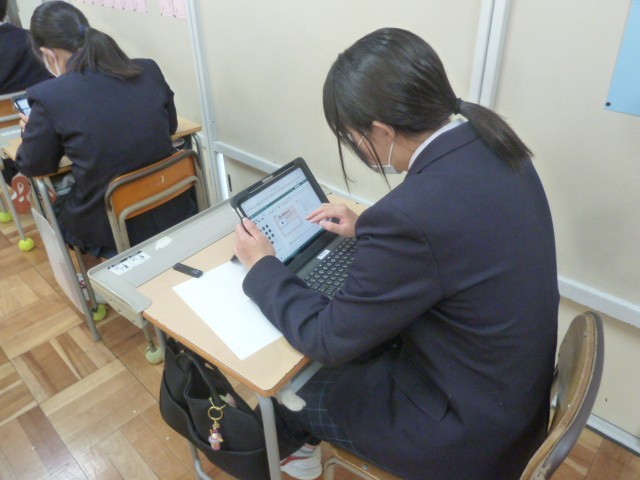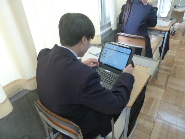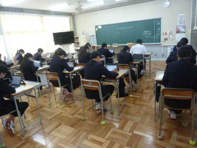 3年生は、「全国学力・学習状況調査」を行いました。日本全国の中学3年生が取り組むテストで、生徒の学力・学習状況を把握・分析し、教師の授業改善につなげることを目的としています。第1日目に取り組んだのは、英語の3技能についてのテストと生徒質問調査でした。タブレットの端末に配信された問題をそれぞれが読み、タブレットを使って解答を入力して答えていきます。3年生は普段からタブレットを活用しながら学習を進めているので、操作はスムーズでしたが、難しい問題もあったためか悩みながら答えていました。しかし、最後まで諦めずに粘り強く問題に取り組んでいました。3年生、よく頑張りました。第2日目の明日は、「国語」と「数学」を実施する予定です。