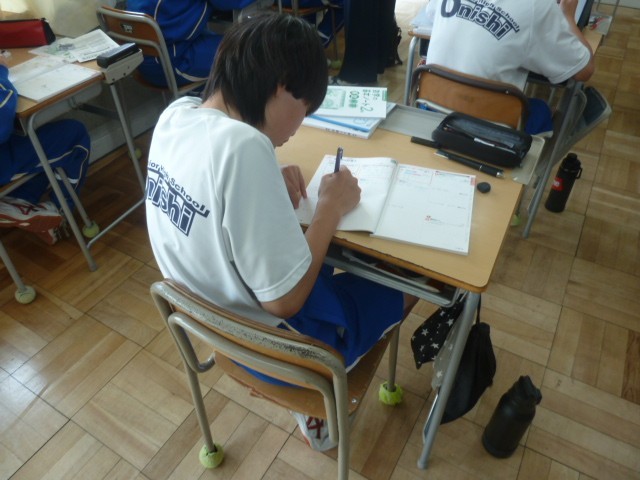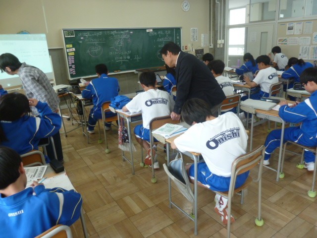 多項式の計算で、「かっこがある式の計算の仕方」や「通分する分数の計算の仕方」が分かった2年生は、適応問題を解きながら、学んだことの定着を図ります。計算の方法があやふやになっているところは、友達同士で教え合いながら問題を解いていました。