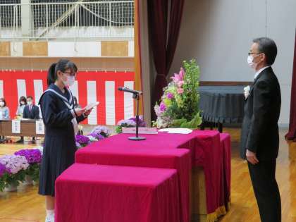 続いて、在校生代表の生徒会長からも歓迎のことばがあり、さらには新入生代表が誓いのことばを述べてくれました。