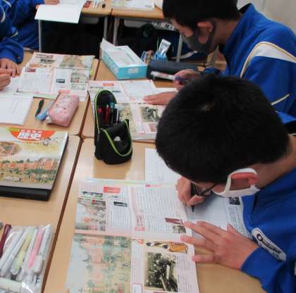 4/26(月) 3年生(社会)「大正時代の文化」 公開日 2021/04/27 更新日 2021/04/27 できごと 大正時代の文化について、ジグソー学習を取り入れた調べ学習を行っています。 資料集を使ったり、タブレットを使ってインターネットで調べたり、みな真剣です。